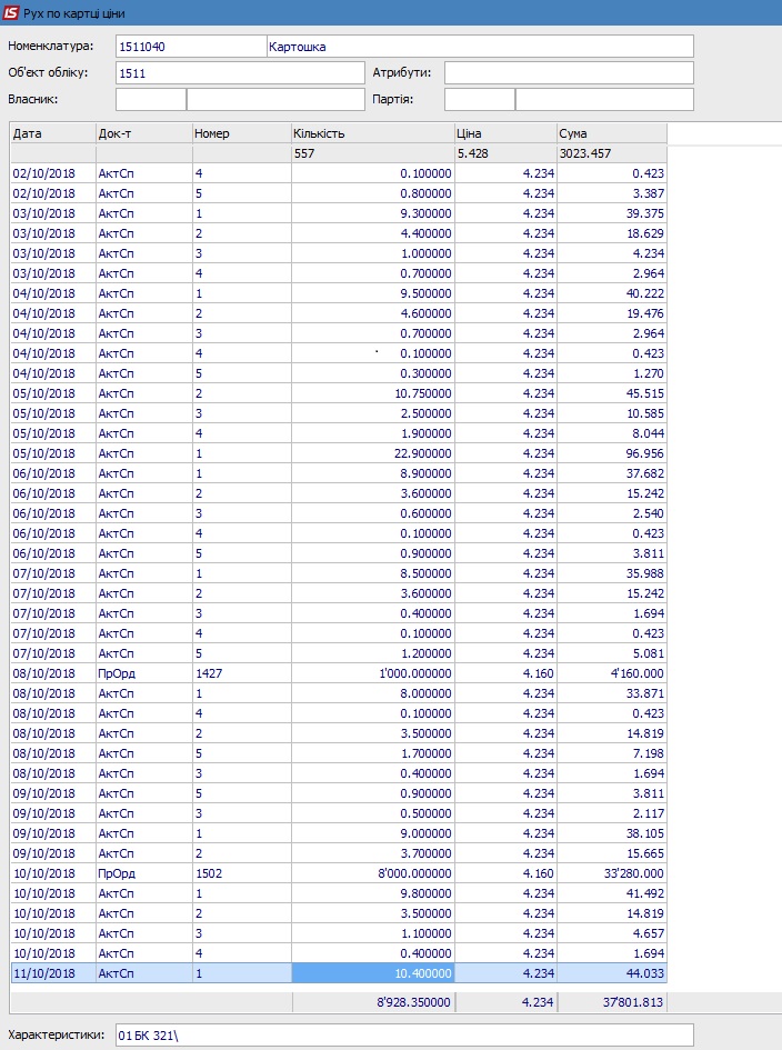 Як бачимо, на початок періоду 01.10 у нас в наявності було 557 кілограм картоплі по ціні 5,428 грн. потім 08.10 та 10.10 ми придбали відповідно 1000 та 8000 кг. по ціні 4,160 грн., а списання яке проходить кожного дня, проводиться по ціні 4,234 грн. за кг. Відповідно на кінець місяця у нас залишилося 8928,35 кг. По ціні 4,234 грн.