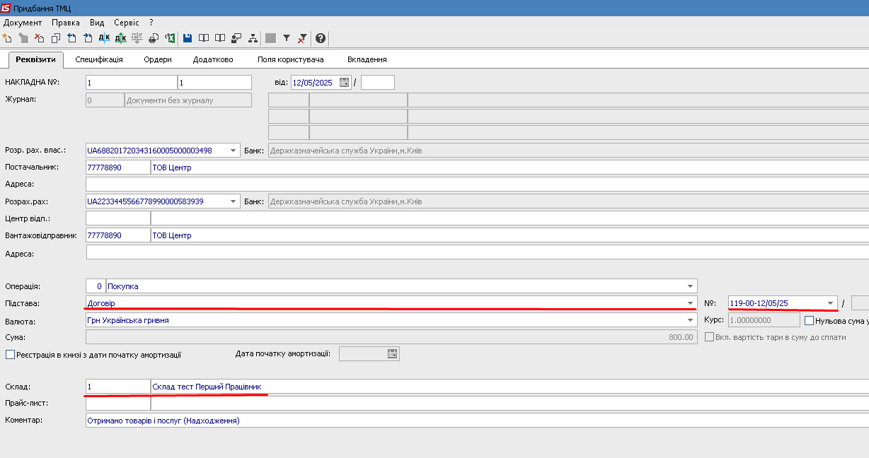 4. Формуємо складський ордер, обираємо проводку «Надходження ТМЦ» і відправляємо в Головну книгу.