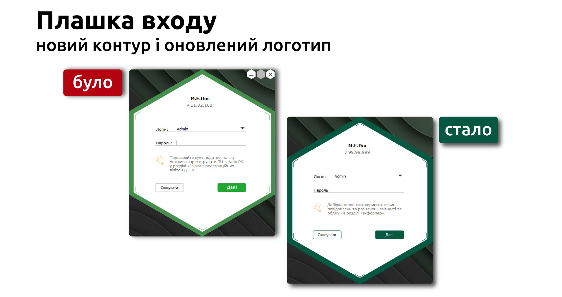 Інтерфейс став світлішим і чистішим, а на формі входу прибрано кнопки закриття/згортання, щоб уникати випадкових натискань. Це відповідає актуальним UX-дослідженням і робить програму безпечнішою для щоденної роботи.
