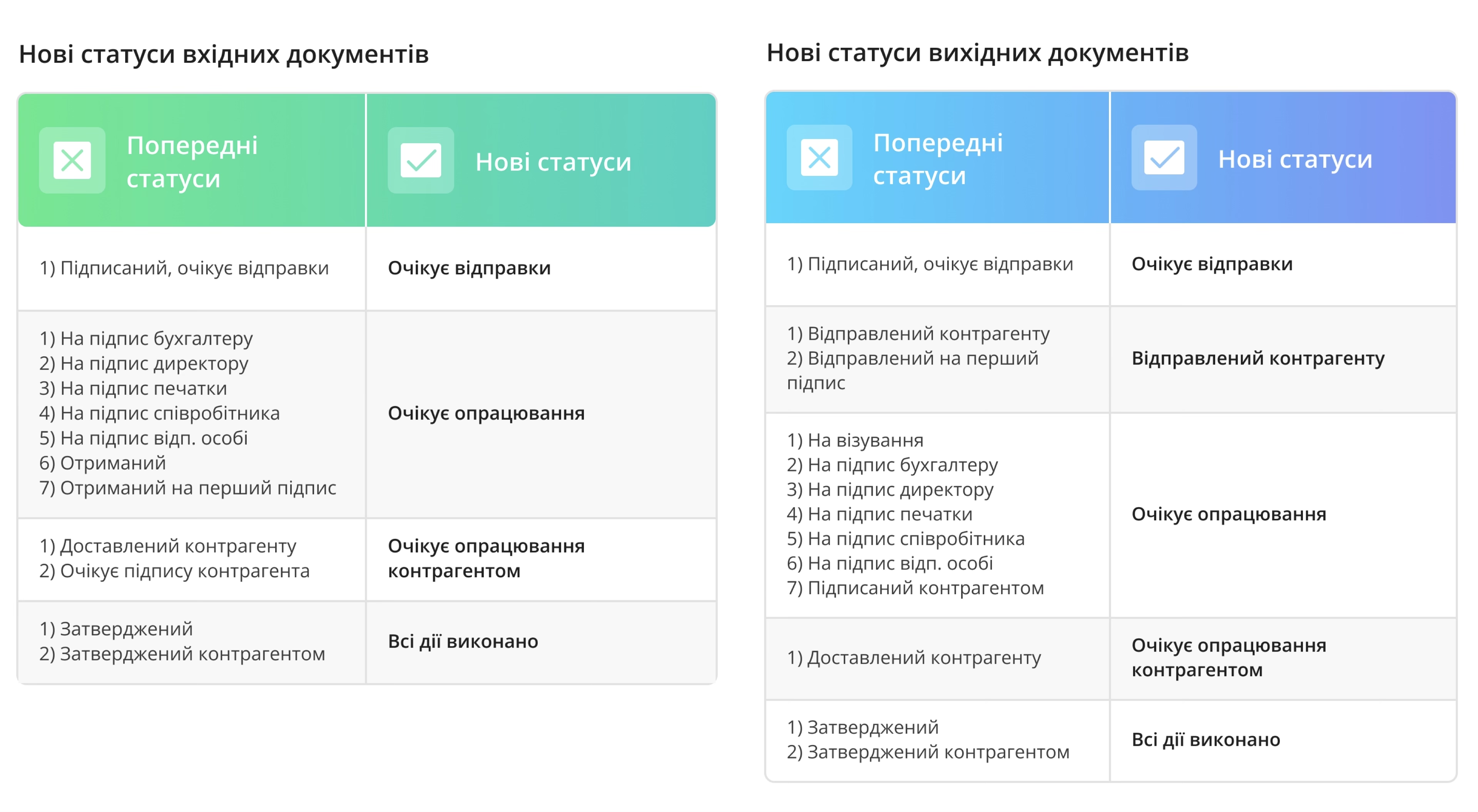 - повернуто попередню систему статусів документів, яка забезпечує більш інформативне та зрозуміле відображення етапів обробки документів.