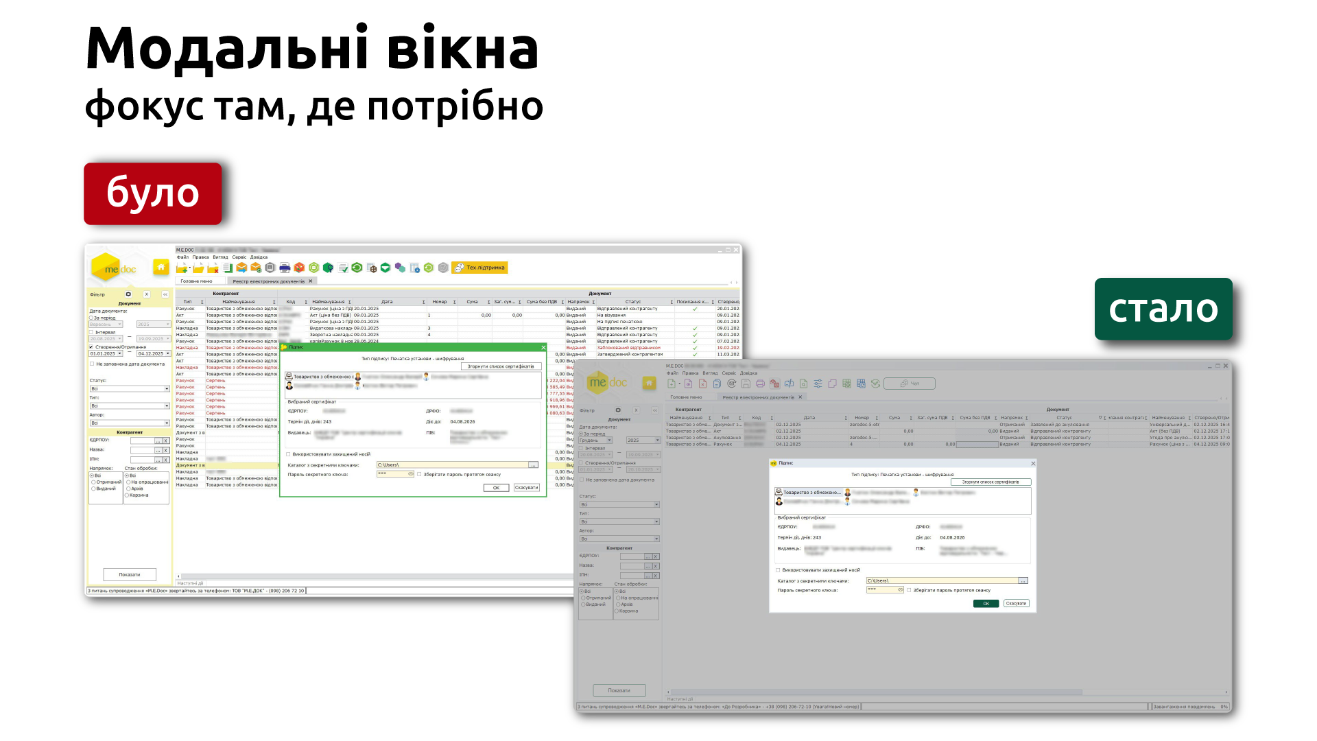 За останні роки M.E.Doc виріс із програмного забезпечення для звітності до комплексної платформи, яка в себе включає: електронний документообіг, облік ПДВ, податковий комплаєнс(автоматичні перевірки документів, формування звітності за актуальними законодавчими нормами, контроль правильності ПН/РК), зарплата, МСФЗ, акциз та інтеграція.