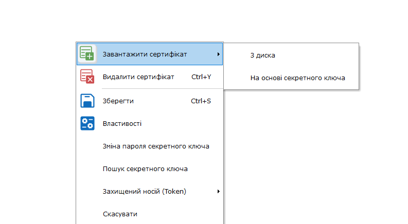 Раніше для додавання сертифіката використовувалася команда «Додати сертифікат». Тепер її замінено на більш функціональну команду «Завантажити сертифікат», яка доступна: