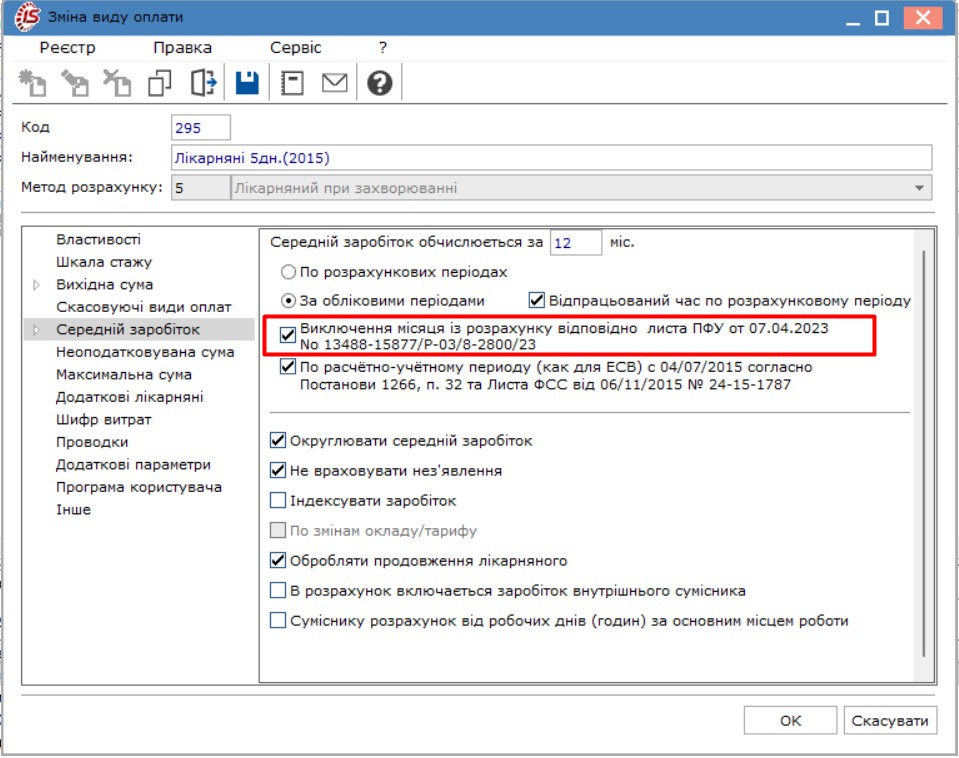 Далі переходимо пункт “Середній заробіток” та встановлюємо галочку на параметрі “Виключення місяця із розрахунку відповідно листа ПФУ від 07.04.2023 № 13488-15877/Р-03/8-2800/23”.