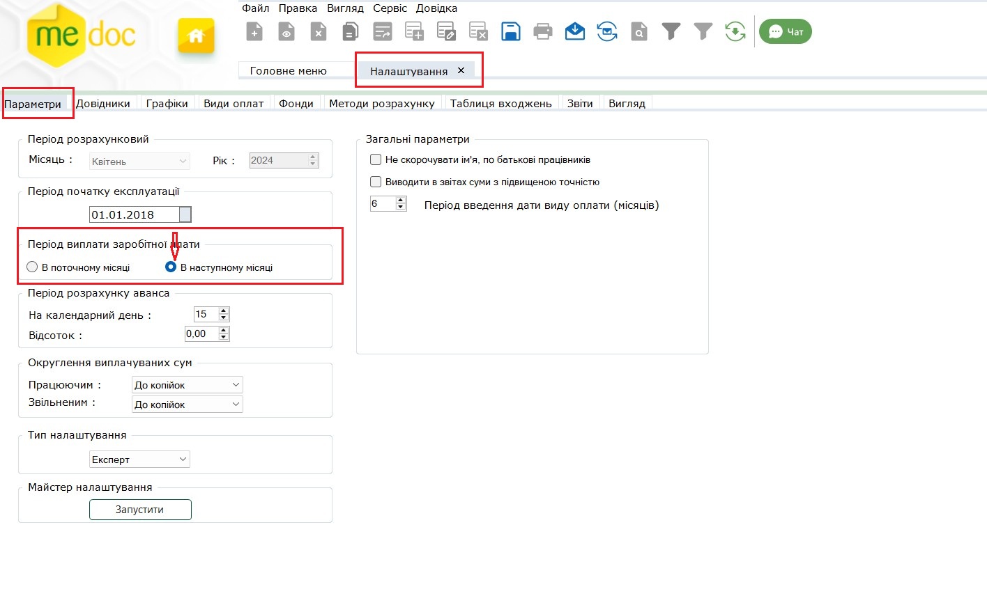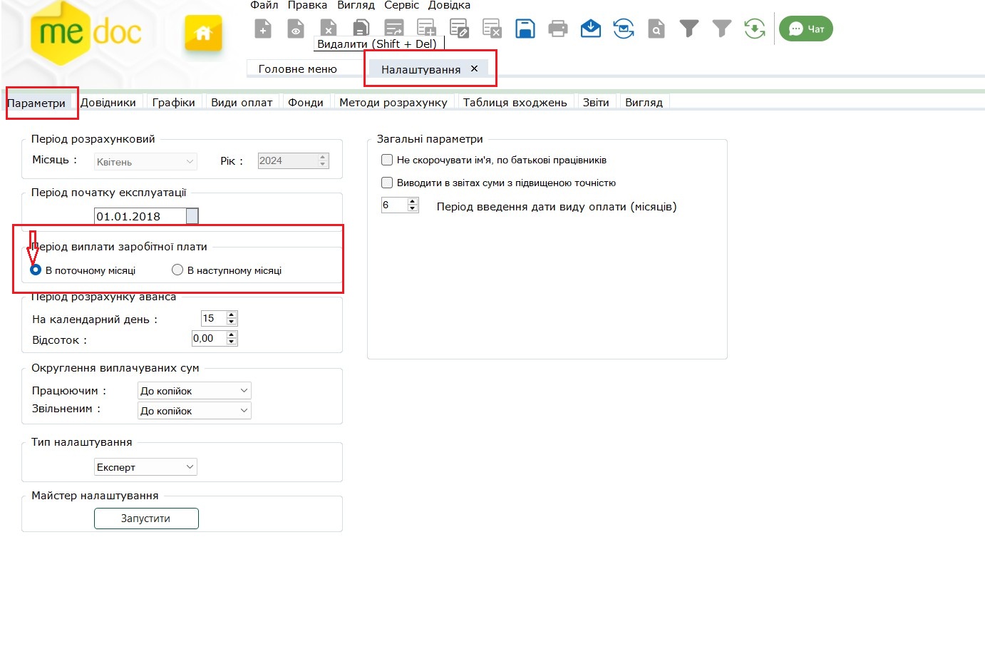 Наприклад, якщо ваше підприємство повністю розраховується по виплаті зарплати до останнього робочого дня місяця, то в такому випадку ви переходите в розділ «Адміністрування» - «Налаштування» - «Параметри» - та у блоці «Період виплати зарплати» обираєте значення «В поточному місяці»
