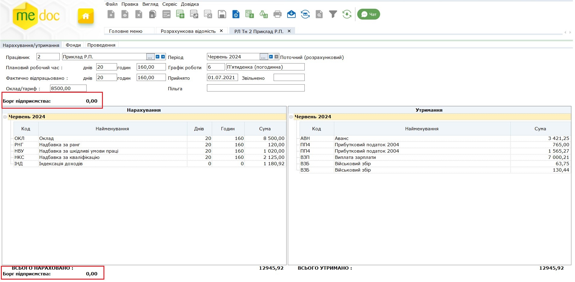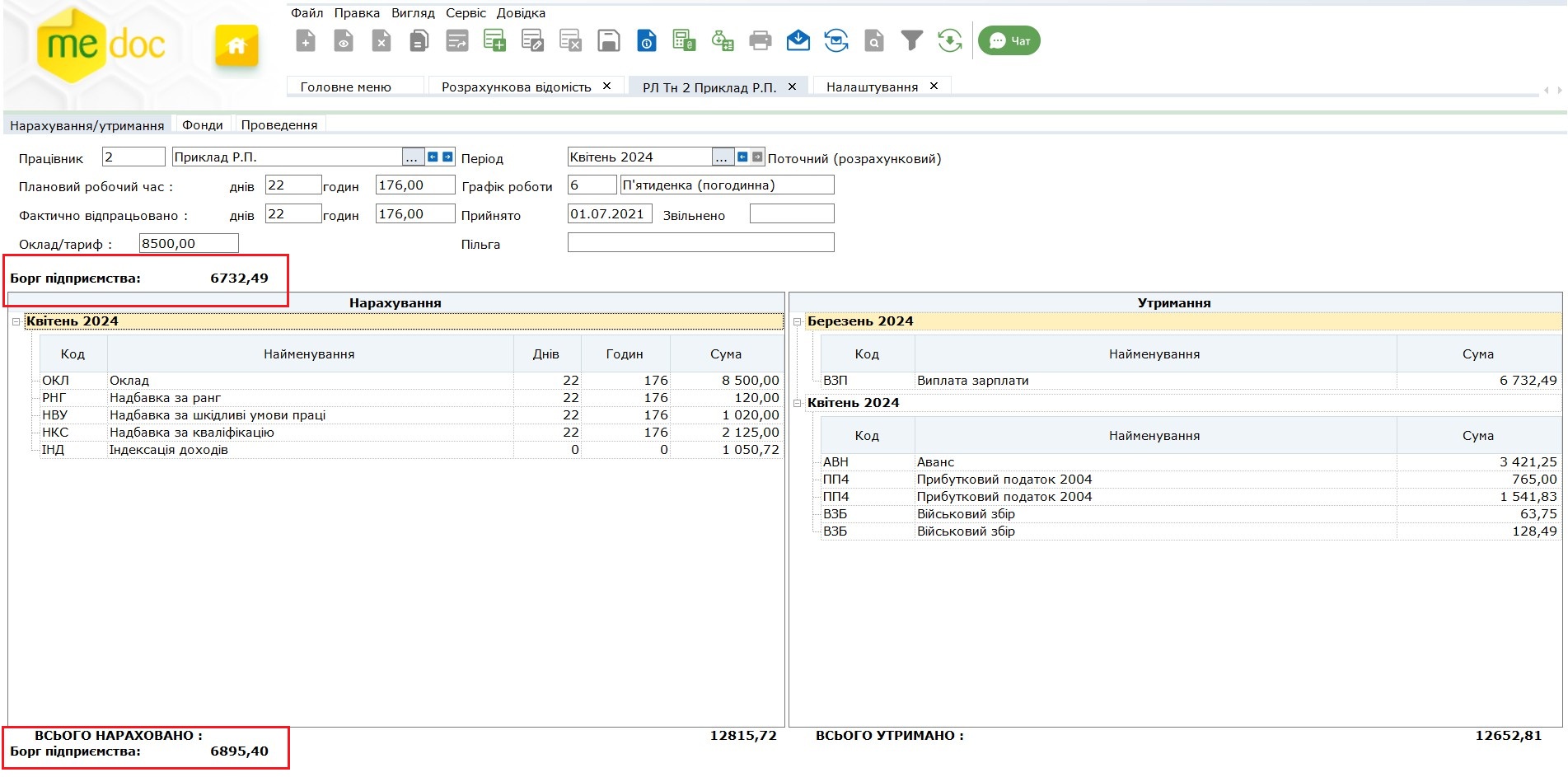 Реквізит «Борг підприємства» по суті є вхідним (на початок місяця) або вихідним (на кінець місяця) залишком по сумі невиплаченої заробітної плати та налаштовується відповідно до термінів виплат зарплати конкретного підприємства.