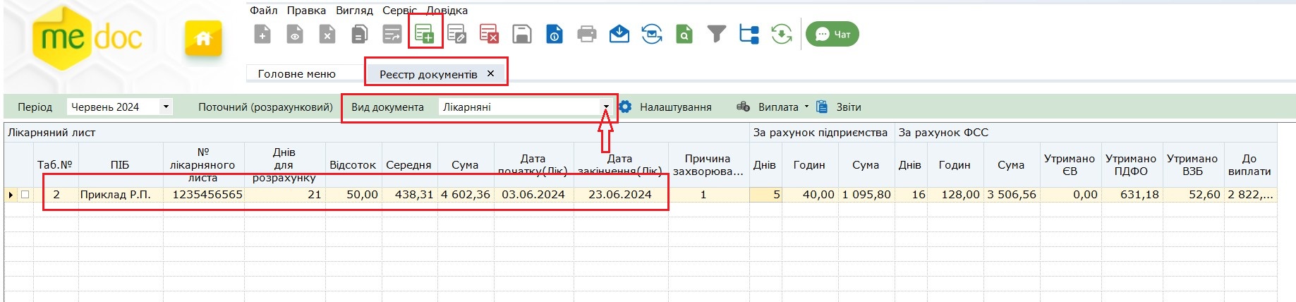 У випадку, якщо працівник під час перебування у відпустці захворів то, після того, як бухгалтер отримав е-лікарняний в статусі «Готовий до сплати» то в ПЗ «M.E.Doc» потрібно: перейти в розділ Реєстр документів, обрати потрібний документ