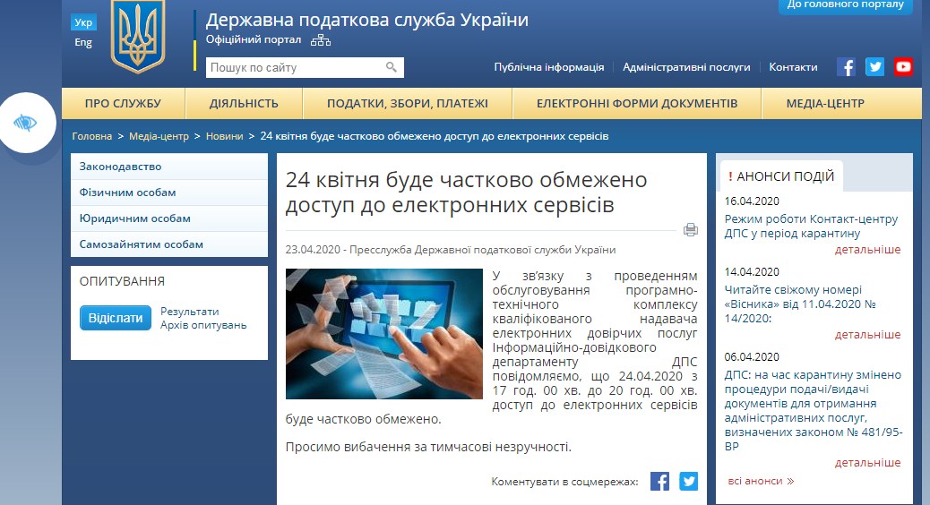 24.04.2020 р. буде частково обмежений доступ до електронних сервісів – ДПС