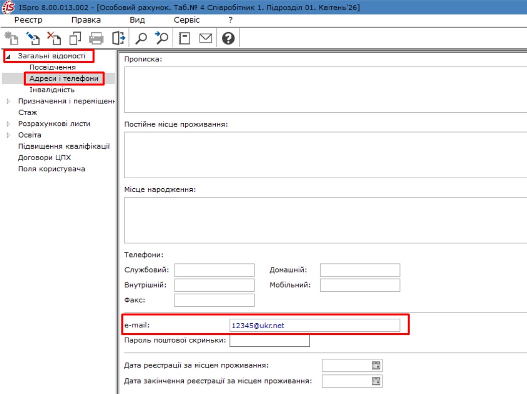 Для цього перед початком роботи необхідно внести електронні адреси працівників за шляхом “Облік праці й заробітної плати” - “Картотека” - “Особові рахунки”, відкрити картку працівника та перейти в “Загальні відомості” - “Адреси і телефони”. У полі “e-mail” вказати адресу електронної пошти працівника (латиницею).
