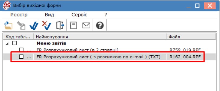 Якщо звіт відсутній, то зайти в “Реєстр” - “Налаштування меню звітів”, знайти звіт 162 “Розрахунковий лист (з розсилкою по e-mail)” та додати його у список (клавіша F5).