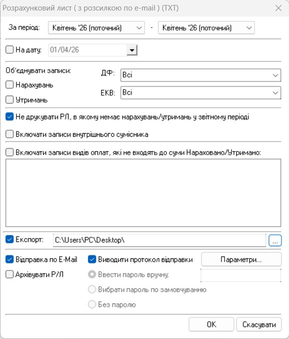 - параметр “Експорт” (для вивантаження Розрахункових листів);